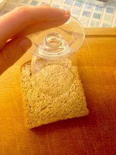 Use a glass to cut circles out of your bread, I find that one slice of bread makes two circles if you go to opposite edges of the slice. Save the left-over bits for the birds, they get hungry over the winter! Place the bread circles in the tins, one in each hole.